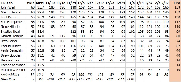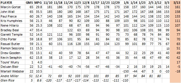 Unsurprisingly for a team that barely ended a five-game losing streak, production for most guys was down. The biggest decliner was John Wall, but he was hardly alone. The team also saw drop-offs from Nenê, Garrett Temple, Rasual Butler, and Kevin Seraphin.