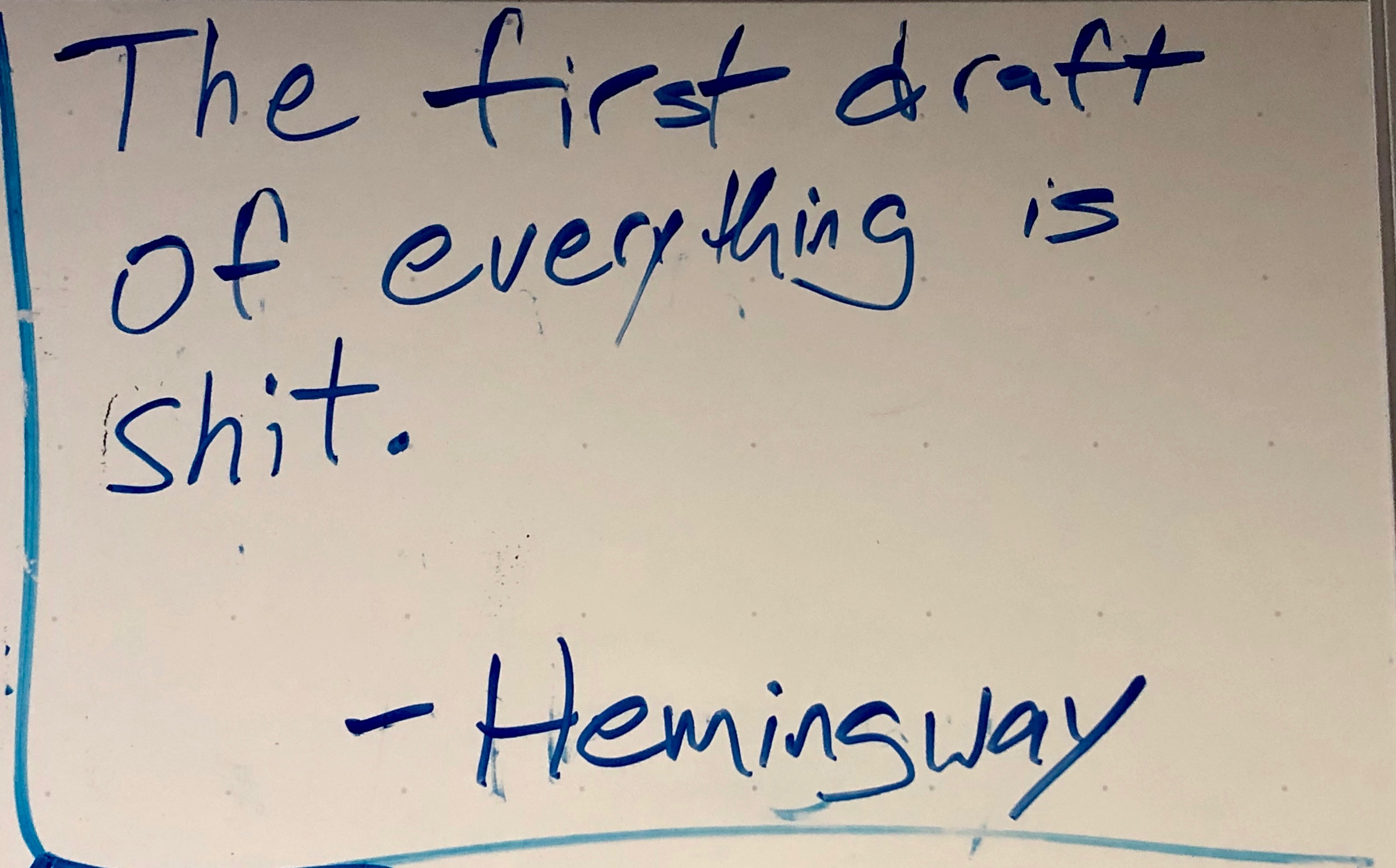 The best writing advice I’ve received came from Ernest Hemingway: “The first draft of everything is shit.” I have it written on the white board on my office as a reminder to get it out of my head and onto a page so I can fix what’s wrong. Agonizing over that first draft is pointless because it’s shit and it’s all going to change.